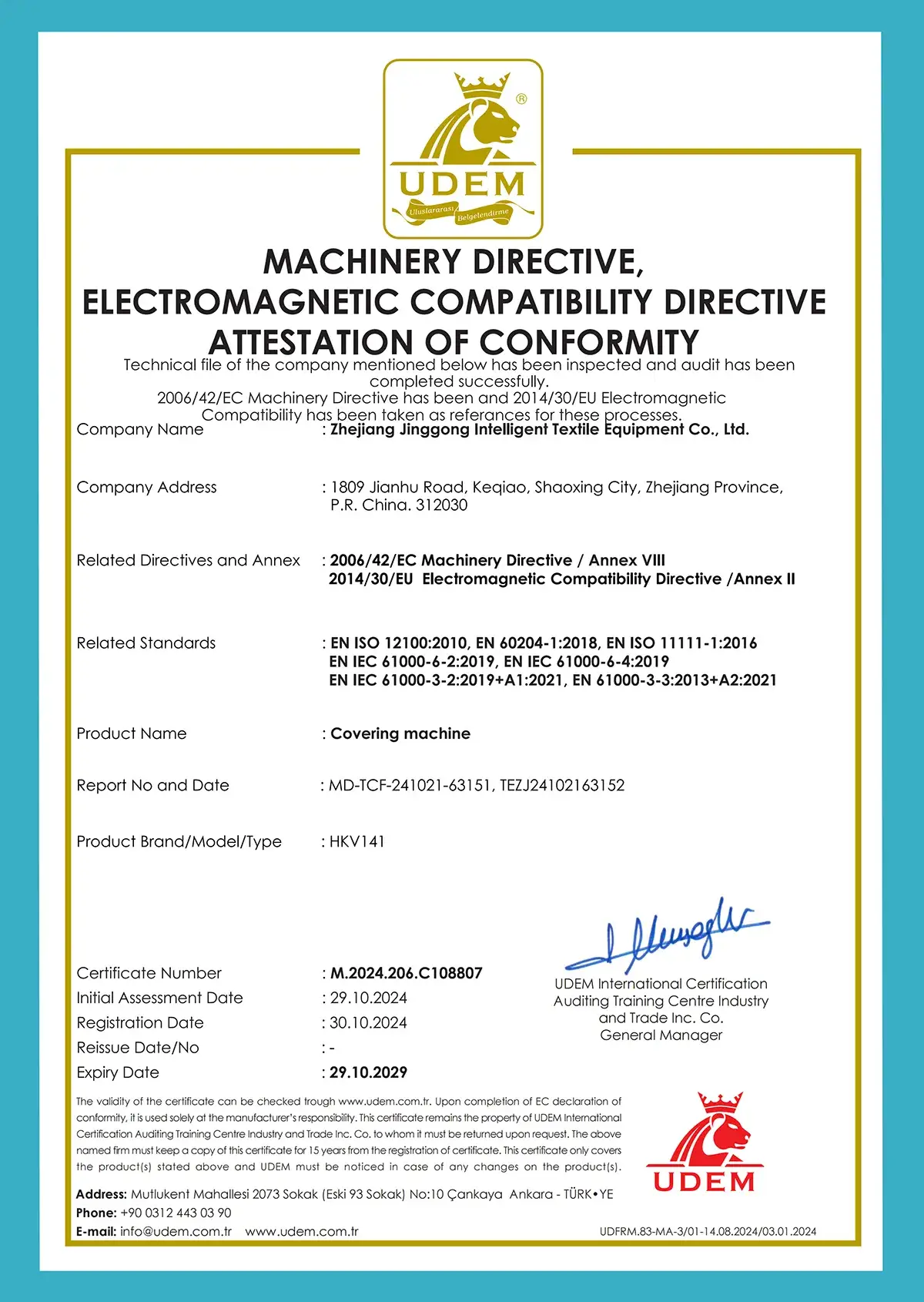 Covering machine - Machinery Directive, Electromagnetic Compatibility Directive Attestation Of Conformity