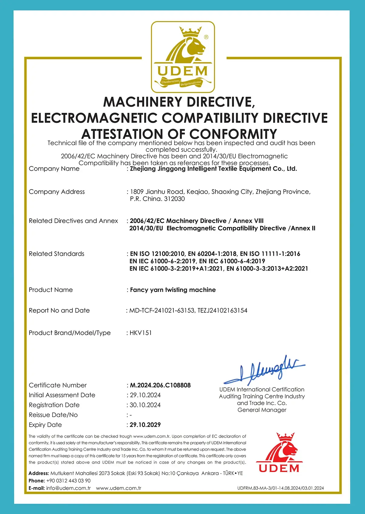 Fancy yarn twisting machine - Machinery Directive, Electromagnetic Compatibility Directive Attestation Of Conformity