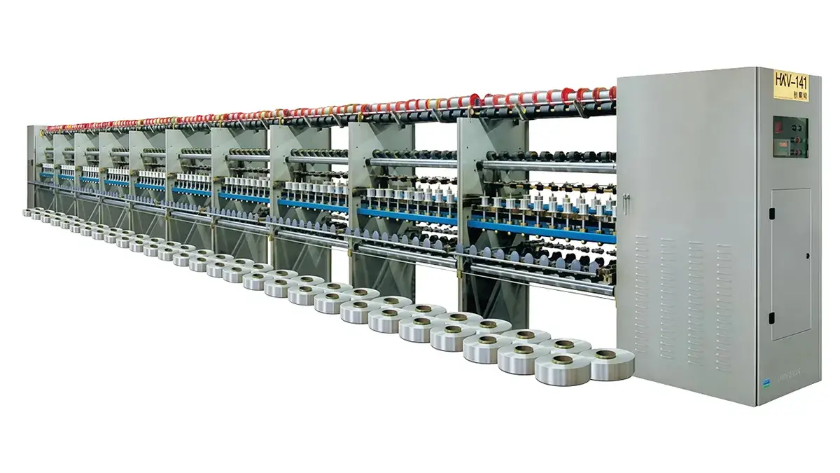 HKV141J is designed for producing ST and MS type metallic covered yarn. In this process, rayon or polyester filament is used as the core yarn, while metallic flat yarn such as ST or MS metallic film is wrapped around the core to form decorative metallic yarn.